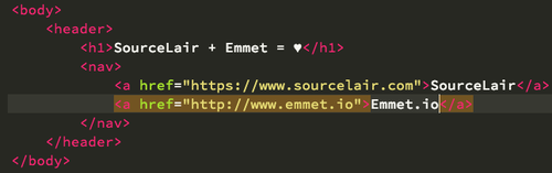 We love tools that let developers focus on being creative while coding, so today we are thrilled to release emmet.io support in SourceLair. Start editing your HTML code, type "a" and then hit Cmd + E to expand it to a full anchor-hyperlink tag, by unleashing the power of abbreviation expansion of emmet.io. Select a part of your code and hit Cmd + Shift + A to be prompted for a tag, to wrap the code that you selected. The possibilities are endless and they are available to you, right inside your browser.