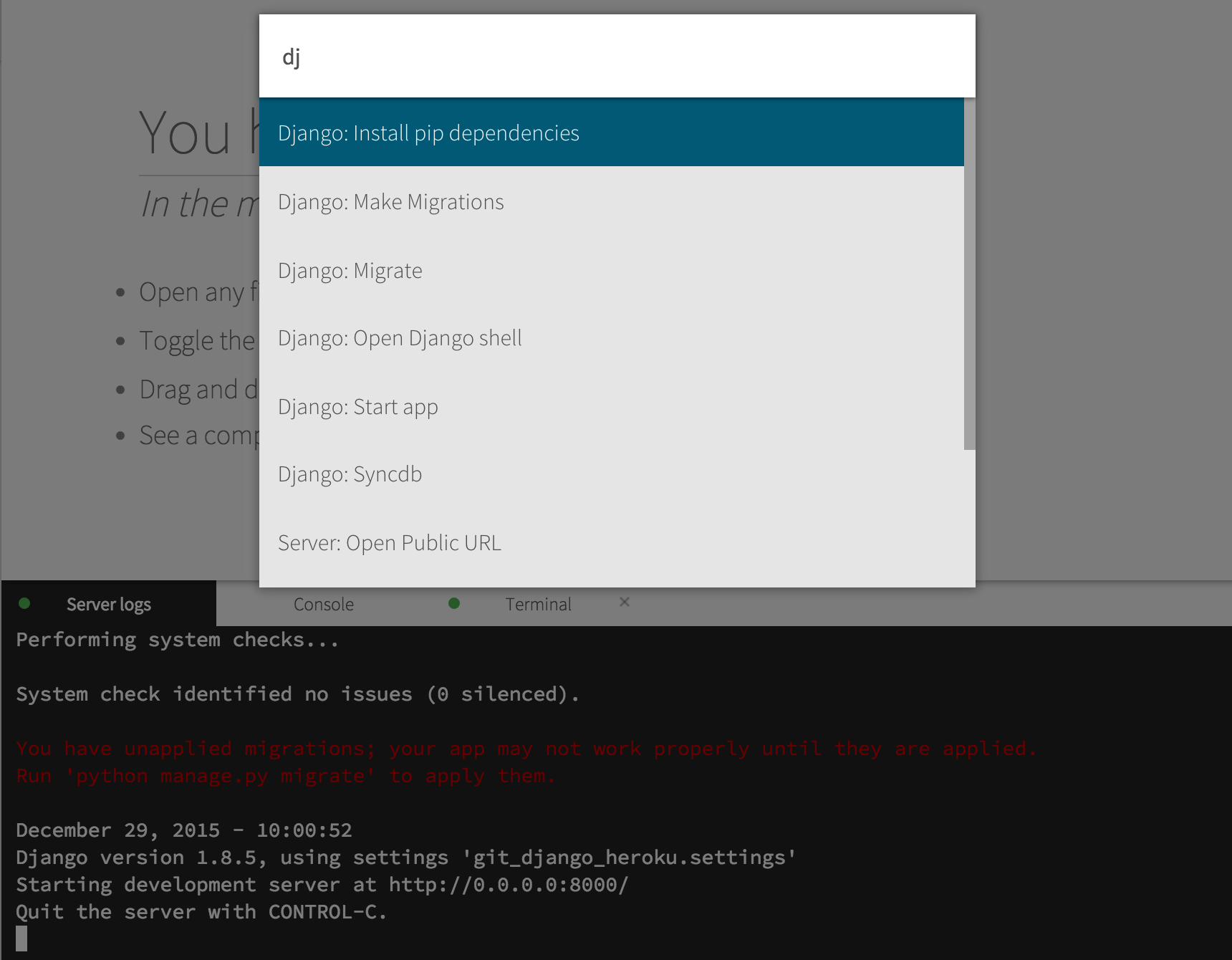 If you select our new Heroku Django project type, you'll enjoy the speed of Command Palette commands, as well as your server being run for you, so you can focus on what you do best; coding.